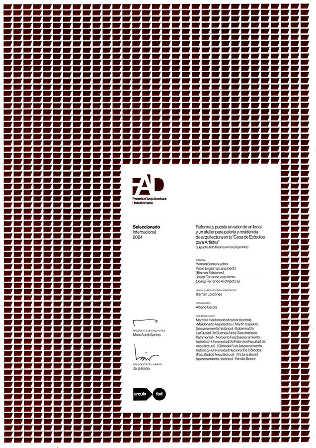 La Galería y Residencia de Arquitectura es apoyada por Saint-Gobain. Las griferías y sanitarios fueron provistos por FV y Ferrum. El mobiliario y los objetos de la residencia del primer piso fueron curados y provistos por lntervista. Las piezas gráficas y cartelerías son provistas por Desalvo.
